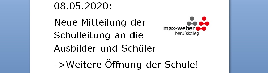 Das MWBK kann aufgrund der gestrigen Entscheidung der Landesregierung NRW (Schulmail Nr. 21) den Präsenzunterricht für weitere Klassen – zumindestens teilweise – wieder aufnehmen. Die zugehörigen Regelungen finden Sie im Brief Nr. 4 der Schulleitung, der hier eingesehen werden kann.