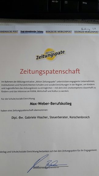 Frau Gabriele Visscher, Steuerberaterin aus Korschenbroich unterstützt das Max-Weber-Berufskolleg seit langen Jahren im Rahmen der Bildungsinitiative „Aktion Zeitungspate“. So können wir unseren Schülerinnen und Schülern das Zeitungslesen ermöglichen und deren Lesekompetenz aktiv fördern. Dafür sind wir Frau Visscher sehr dankbar.