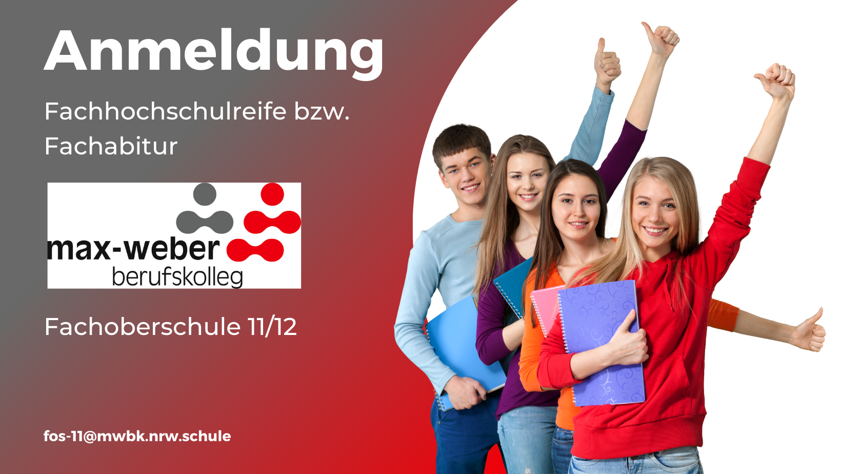 Bedingung für die Aufnahme ist ein Beratungsgespräch. Dafür nehmen Sie bitte unter FOS-11@mwbk.nrw.schule Kontakt zu Herrn Ringels, dem Bildungsgangleiter, auf und vereinbaren einen Termin.