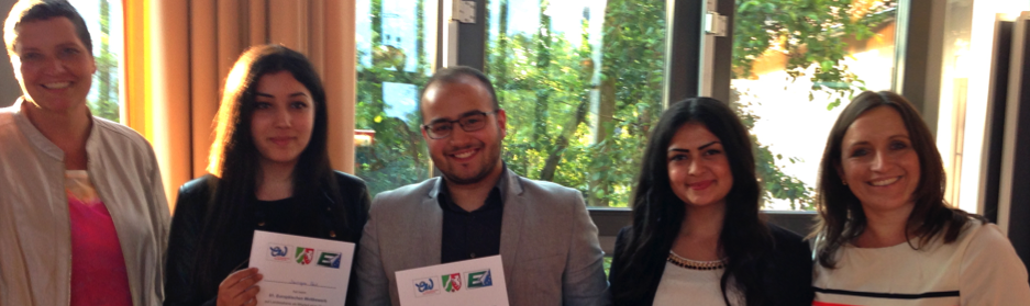 Staatssekretär Dr. Eumann überreicht den Schülern des Max-Weber-Berufskollegs einen der 3. Preise beim 61. Europäischen Wettbewerb.