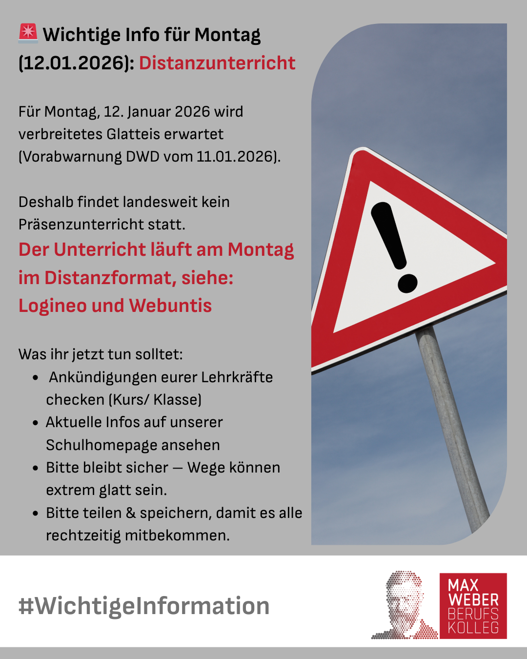 Auf Grundlage des Erlasses „Regelungen zum Unterrichtsausfall und anderen schulischen Maßnahmen bei Unwettern und anderen extremen Wetter-Ereignissen“ vom 10. Oktober 2022 findet am Montag, 12. Januar 2026, landesweit kein Präsenzunterricht statt. Der Unterricht wird an diesem Tag als Distanzunterricht durchgeführt.