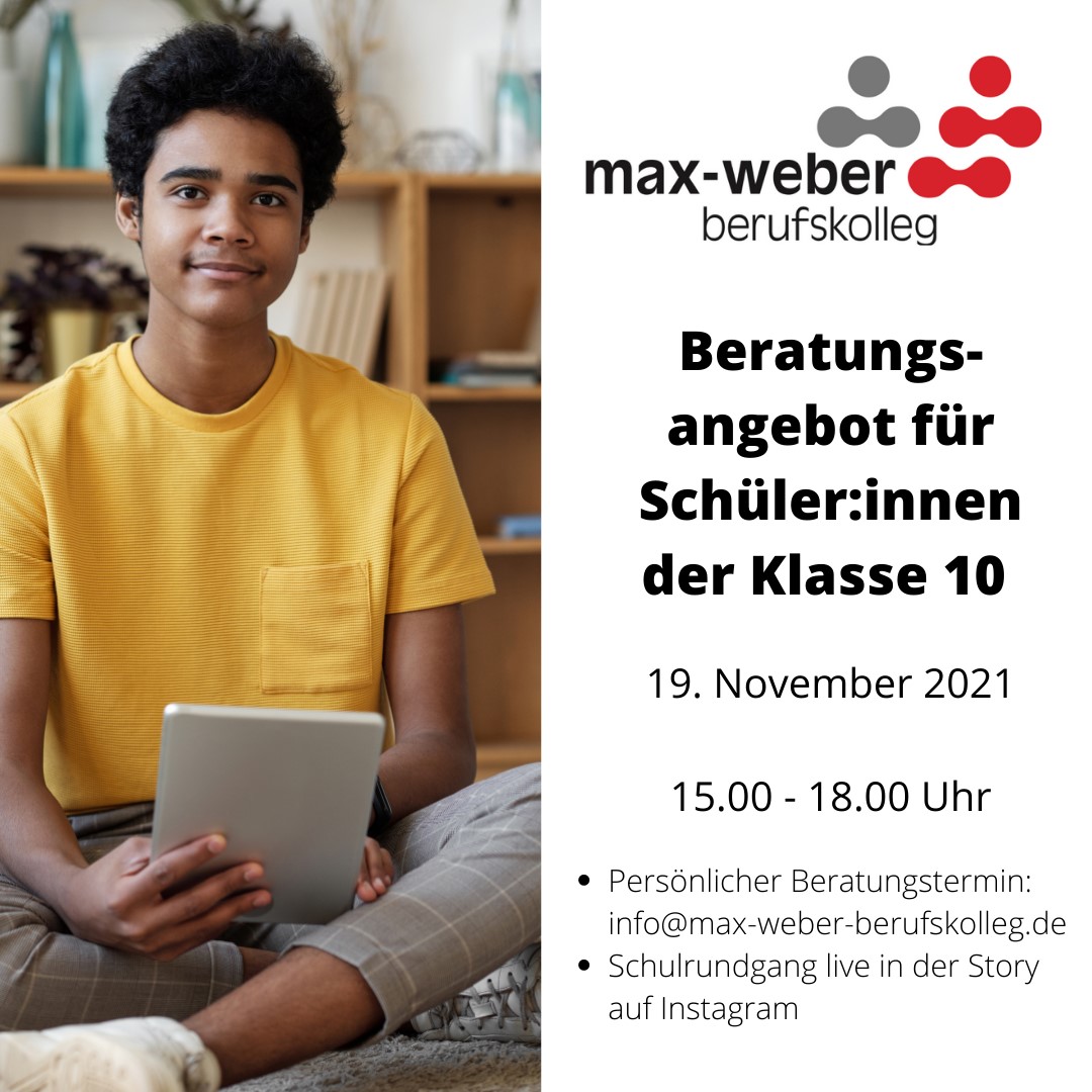 Über die Email-Adresse: info@max-weber-berufskolleg.de können Sie einen persönlichen Beratungstermin buchen. Gerne informieren wir sie dort über: Höhere Handelsschule – Fachoberschule 11/12 – Fachoberschule Polizei.