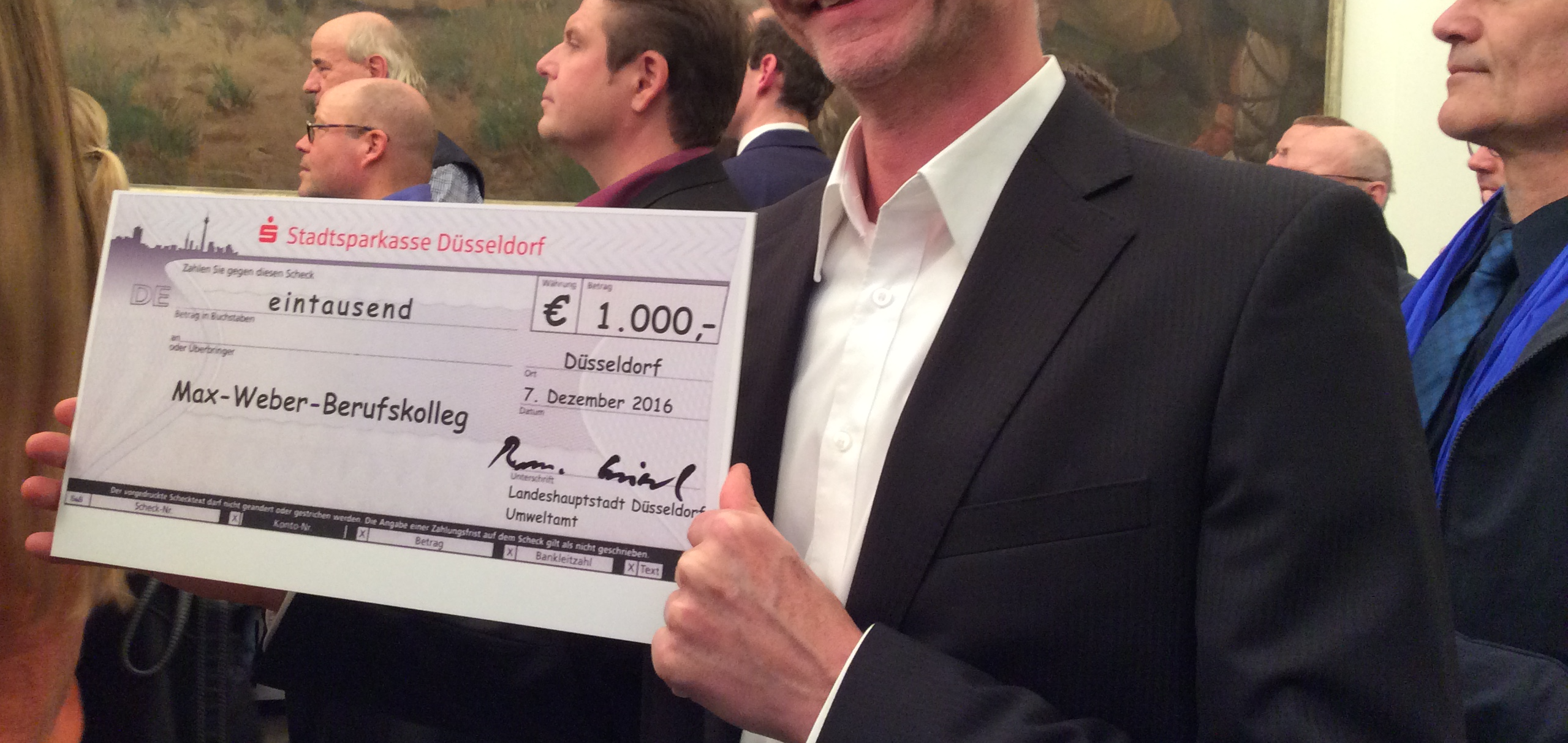 In einer Feierstunde im Rathaus verlieh Oberbürgermeister Thomas Geisel unserer Schule im Wettbewerb „Mobil mit Stil – umweltfreundlich unterwegs“ einen mit 1.000 Euro dotierten Umweltpreis. Der Hintergrund: Viele Schülerinnen und Schüler der Berufsschule und der Fachoberschule wohnen im Umfeld Düsseldorfs, arbeiten aber in Düsseldorf und/oder gehen dort auch zur Schule. Diese Schülerinnen und Schüler verfügen bereits häufig über ein eigenes Auto, welches sie dann i.d.R. auch für die Fahrt zur Schule nutzen, allen Schwierigkeiten des Verkehrs und der Parksituation zum Trotz.