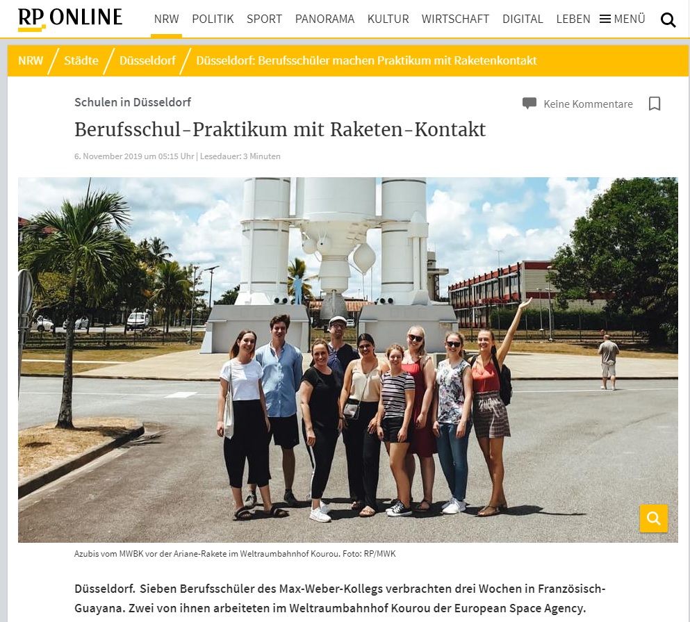 Die Rheinische Post hat in Ihrer Ausgabe vom 6.11.2019 einen Bericht über unsere sieben Praktikanten veröffentlicht, die vom 7. bis zum 25. Oktober 2019 in Kourou, Französisch Guyana waren. Den vollständigen Beitrag finden Sie hier in der Rheinischen Post oder hier!