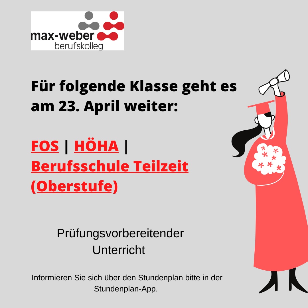 Wir beginnen am Donnerstag, den 23.04.2020 mit einem prüfungsvorbereitenden Unterricht nach einem Sonderplan, den Sie auf dsb Mobile finden, in allen Abschlussklassen der Höheren Handelsschule, Fachoberschule und Berufsschuloberstufen in Teilzeitunterricht.